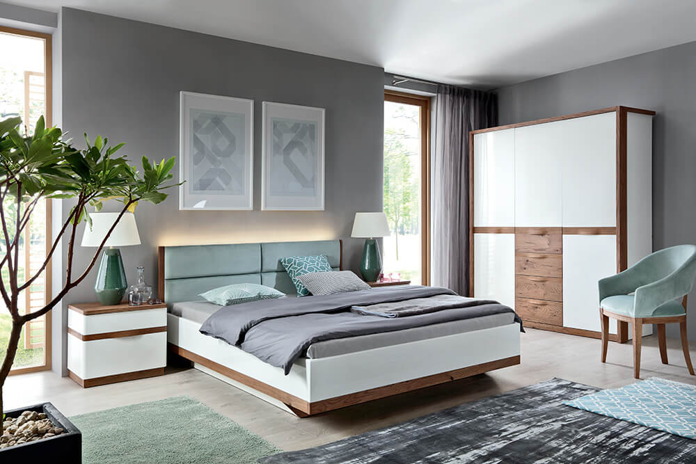 Baltas blizgus paviršius + ąžuolas Como / Mocca matinė + ąžuolas Como.